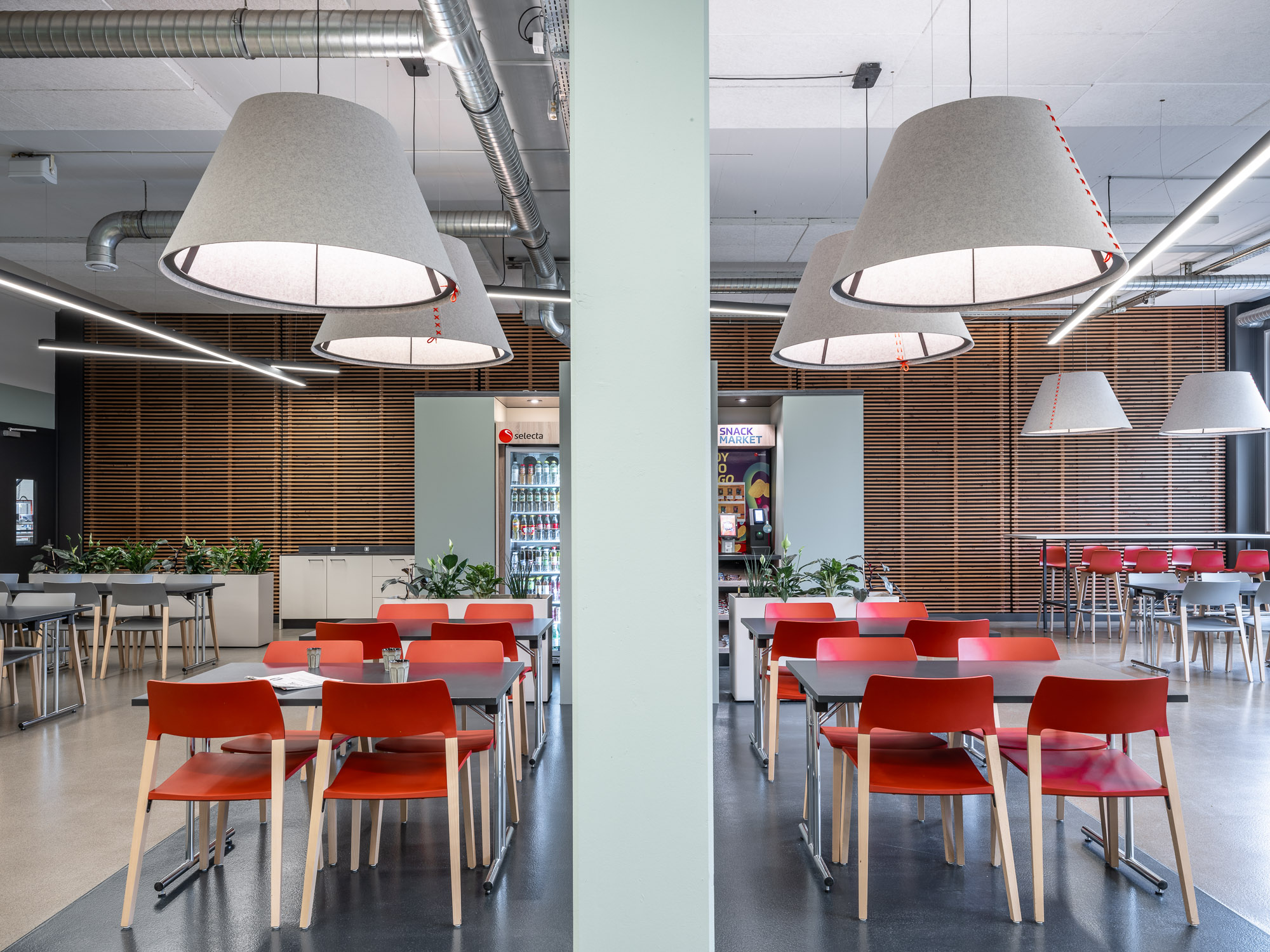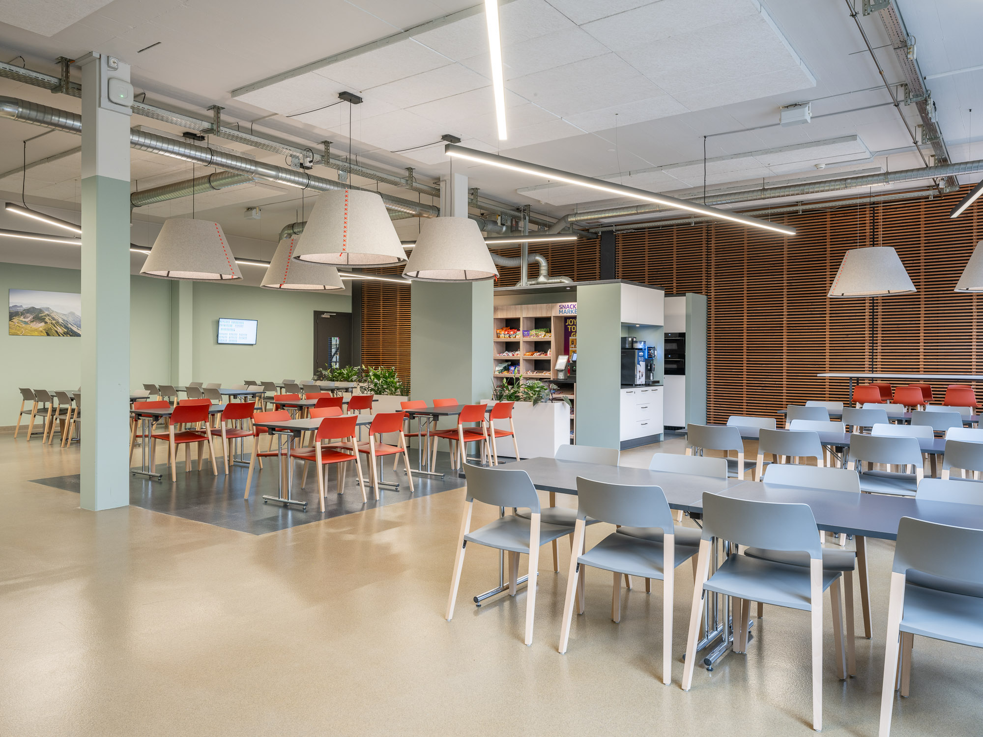 Ein warmes Farb- und Materialkonzept schafft eine angenehme Atmosphäre, während die gezielte Beleuchtung unterschiedliche Nutzungszonen unterstützt. Flexibles Mobiliar ermöglicht sowohl spontane Gespräche als auch Austausch zwischen verschiedenen Abteilungen.